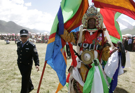 guard during a cultural festival in Yushu, west China's Qinghai province