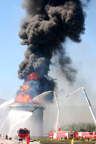 Smoke billows out while firemen spray water over a blazing oil tanker during a fire drill at a training base of the regional fire brigade in Urumqi, capital of Northwest China's Xinjiang Uygur Autonomous Region on August 23, 2007. [Xinhua]