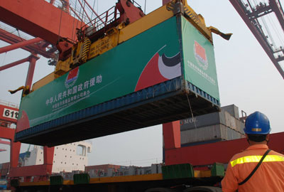 A container of humanitarian aid is loaded on a ship in a port in North China's Tianjin Municipality August 24, 2007. China's fifth batch of humanitarian aid for Sudan, worth 40 million yuan, left the port on Friday. [Xinhua]