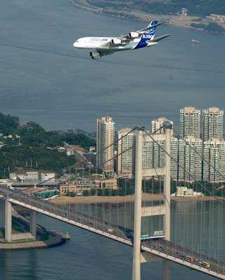 An Airbus A380 flies past Hong Kong's Tsing Ma Bridge during a demonstration flight to mark the Asian Aerospace International Expo and Congress held in the territory September 3, 2007. European plane-maker Airbus expects Chinese airlines will need up to 150 of its jets over the next five years, including its giant A380s, as Chinese airlines expand to serve a domestic and international travel boom. [Reuters]