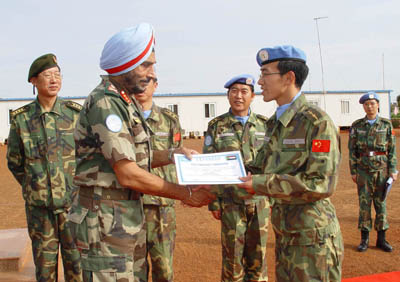 KHARTOUM: Chinese peacekeepers were on Wednesday awarded certificates of merit for their excellent performance during their eight-month term in Sudan, a Chinese officer said Thursday. Lieutenant General Jasbir Singh Lidder, commander of the UN Mission in Sudan (UNMIS), presented Unit Citations to the engineering, transportation and medical contingents of Chinese peacekeeping troops, and Force Commander Commendations to 22 Chinese troops. The two certificates of merit are the highest honor awarded to peacekeepers from various contributing countries in Sudan, said the Chinese officer. The awards ceremony was held at the base of the Chinese peacekeeping troops in Wau, capital of West Bahr al-Ghazal state in southern Sudan, two weeks before their departure from Sudan to rotate with another batch of Chinese peacekeeping troops. Lidder said it was a great honor for him to serve with the Chinese peacekeepers as they were ending "their very successful term" in Sudan. "During the past months, the three contingents of the Chinese peacekeeping troops have done a significant job to be a role model for professionalism, commitment and conduct," Lidder said. The Chinese peacekeepers had also maintained excellent relations with the contingents of other countries as well as the local population, the UNMIS commander said. Li Chengwen, the Chinese Ambassador to Sudan, congratulated all the three contingents, the 22 Chinese peacekeepers as well as the other officers and soldiers. He highly praised their performance in Sudan, especially in the extremely difficult and complicated conditions. The 435-strong Chinese peacekeeping troops, the second batch of Chinese peacekeepers deployed in southern Sudan since China started taking part in UN peacekeeping operation there in May last year and arrived in Wau in January this year. |