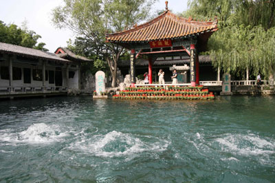 Tourists watch the spewing of the Baotu Spring in Jinan, capital of East China's Shandong Province, Sept. 5, 2007. The water table of the Baotu Spring reached 28.74 meters on Wednesday. The spring has been spewing since its re-spewing in September 2003. [Xinhua]