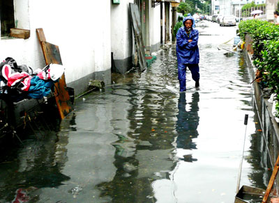 Updated: 2007-09-18 23:59 ![]() A resident wearing a raincoat makes his way on a flooded street in Taizhou, East China's Zhejiang Province September 18, 2007. Much more heavy rainfalls are about to hit the province as Typhoon Wipha makes landfalls in the East China provinces. [newsphoto]
