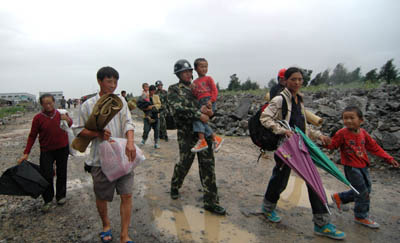Chinese soldiers help migrant workers relocate to safe places in Taizhou, East China's Zhejiang Province Tuesday, September 18, 2007, as Typhoon Wipha approached. More than 2 million people in east China have been relocated before the landfall of Wipha, which might be the most destructive typhoon in a decade. [newsphoto]