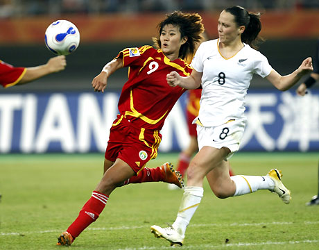 Updated: 2007-09-21 17:21 ![]() China's Han Duan (L) and New Zealand's Hayley Moorwood fight for the ball during their Group D soccer match at the 2007 FIFA Women's World Cup in Tianjin September 20, 2007. China entered quarterfinals with a 2-0 win over New Zealand. [Reuters]