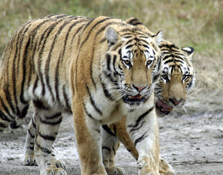Photo taken on Sept 26, 2007 shows two Siberian Tigers of a zoo in Heilongjiang Province are on the way to Xiamen, East China's Fujian Province to be hired out for "work" to alleviate the economic pressure of this zoo. [newsphoto]