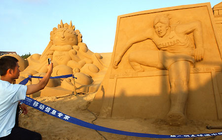 A visitor takes a photo of a sand creation with China's world 110m hurdles record holder Liu Xiang crossing a hurdle, on Zhujiajian Island, East China's Zhejiang Province, September 29, 2007. These and other sand sculptures were made by 30 artists from 10 countries, including China, the US and Russia, to welcome the 2008 Beijing Olympics as well as illustrate the history of the Games. [Xinhua]