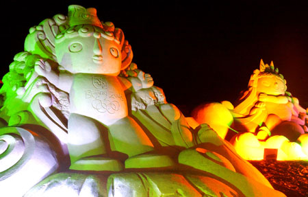 Two large sand sculptures of Fuwa mascots, Jingjing (L) and Yingying, are seen on Zhujiajian Island, Southeast China's Zhejiang Province, September 29, 2007. These and other sand sculptures were made by 30 artists from 10 countries, including China, the US and Russia, to welcome the 2008 Beijing Olympics as well as illustrate the history of the Games. [Xinhua]