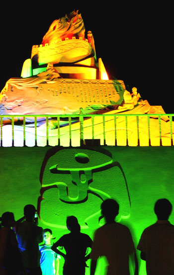 Visitors look at a large sand building with the Beijing Olympic logo on Zhujiajian Island in East China's Zhejiang Province, September 29, 2007. The sand sculptures were made by 30 artists from 10 countries, including China, the US and Russia, to welcome the 2008 Beijing Olympics as well as illustrate the history of the Games. [Xinhua]