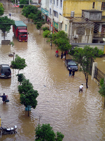 Streets in Putian county, Ningde city in Zhejiang Province are flooded October 7, 2007. Typhoon Krosa slammed into southeast coast provinces Sunday afternoon, prompting the evacuation of more than 1 million people, and it weakened to a tropical storm after coming ashore. [Xinhua]