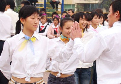 Students clap hands during a collective dance competition in Wuzhi, Central China's Henan Province October 9, 2007. The collective dance on campus has hit a snag as it is regarded as a source for puppy love among students. [newsphoto]