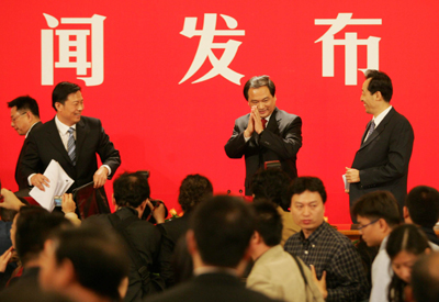 Party spokesman Li Dongsheng thanks the media after the first press conference of the 17th National Congress of the Communist Party of China (CPC) in Beijing on October 14, 2007. The congress, to be held from October 15 to 21, will decide China's new leadership and the path China will follow in the next five years or more. [newsphoto]
