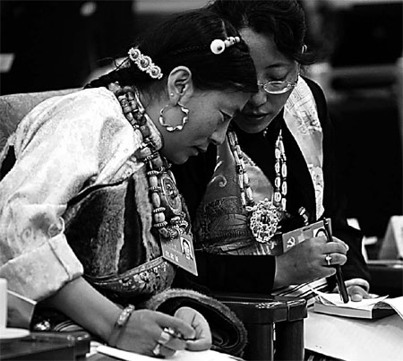 | Lun Zu (left) and Deji Zhuosang, delegates from the Tibet Autonomous Region attending the 17th Party Congress, yesterday discuss the political report delivered by Hu Jintao on Monday.Xu Jingxing |
