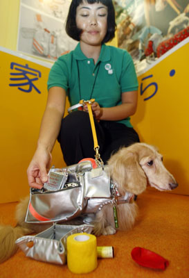 Updated: 2007-10-17 23:27 ![]() A promotional worker from Sidereal Co. Ltd shows the contents of a rescue jacket for pets, at a demonstration, during the Security and Safety Trade Expo in Tokyo October 17, 2007. The rescue jacket for either a pet dog or cat contains an emergency kit and food, for use in a possible disaster, and the price ranges from JPY 28,000 to JPY 50,000. [Agencies]