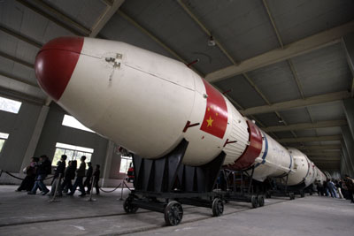 Updated: 2007-10-19 21:33 ![]() Visitors walk past Long March III carrier rocket at the Xichang Satellite Launch Center (XSLC) located in Southwest China's Sichuan Province October 18, 2007. The country's first moon orbiter, Chang'e I, is set to be launched on October 24. [newsphoto]