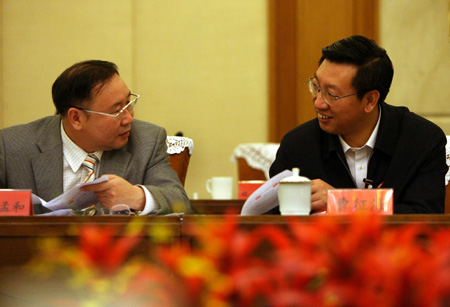 Two delegates from the Inner Mongolia Autonomous Region talk during a group discussion of the congress in Beijing, October 19, 2007. [Xinhua]