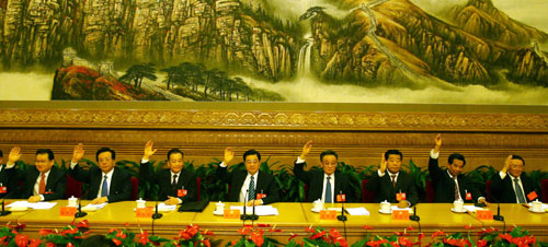 President Hu Jintao (4th from left), general secretary of the Central Committee of the Communist Party of China, and other top Party leaders attend the third presidium meeting of the 17th National Congress at the Great Hall of the People October 20, 2007. The meeting adopted the draft lists of candidates for the Central Committee and Central Discipline Commission of the Communist Party of China. [Xinhua]