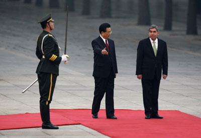 China's President Hu Jintao (C) motions to Costa Rica's President Oscar Arias during a welcoming ceremony outside the Great Hall of the People in Beijing October 24, 2007. [Agencies]