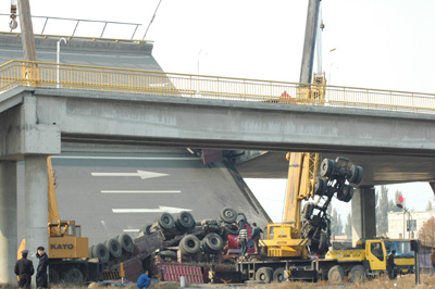Police examine destroyed vehicles after a section of an expressway flyover in Baotou, North China's Inner Mongolia Autonomous Region collapsed on Wednesday, October 24, 2007. The incident occurred when three heavy trucks laden with steel plates crossed the bridge at about midnight. Four people were injured when the road section fell and the railway beneath was forced to close. [newsphoto]
