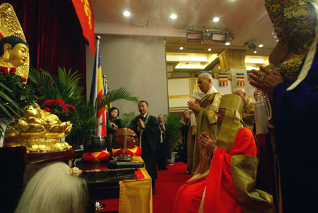Japanese monks pray for world peace at a Buddhist ceremony held before the openning of the 10th China-Japan-South Korea Buddhist Friendship Exchange Conference, October 26, 2007. [newsphoto]