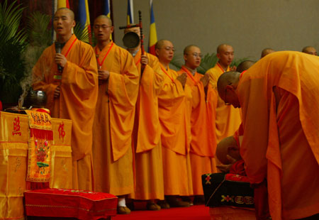 Chinese monks pray for world peace at a Buddhist ceremony held before the open of the 10th China-Japan-South Korea Buddhist Friendship Exchange Conference, October 26, 2007. [newsphoto]