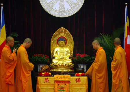 Chinese monks pray for world peace at a Buddhist ceremony held before the open of the 10th China-Japan-South Korea Buddhist Friendship Exchange Conference, October 26, 2007. [newsphoto]