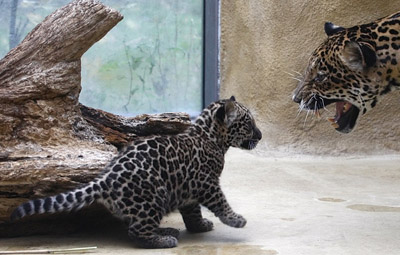 Jaguar mother "Sally" looks at her eight weeks old cub in their enclosure at the Munich zoo October 26, 2007. The jaguar cub was born on September 2 in the zoo. [Agencies] |