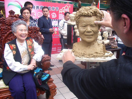 A craftsman makes a sculpture of an old lady on Wang Fujing Street in Beijing October 27, 2007. Some old and famous shops on the street opened to promote themselves at the on-going "Wang Fujing Commercial Culture Festival". [Xinhua]