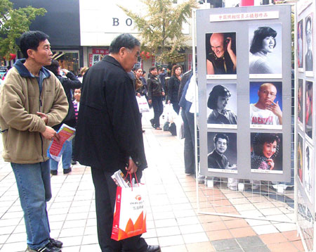 Passers-by look at the photos by China Photo Studio, an old and famous photo studio, on Wang Fujing Street in Beijing October 27, 2007. Some old and famous shops on the street opened at the on-going "Wang Fujing Commercial Culture Festival". [Xinhua]