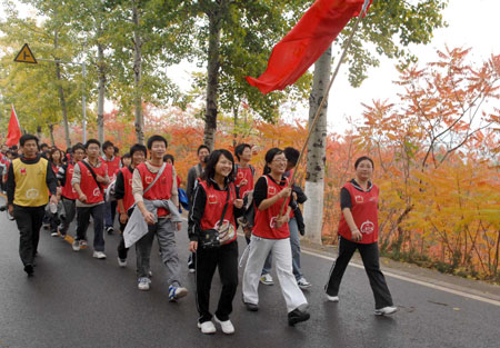 Participants walk in line near the Ming-tomb reservoir in Changping District of Beijing during the Beijing International Long Walk Carnival October 27, 2007. More than 10,000 participants from home and abroad took part in the walk. [Xinhua]