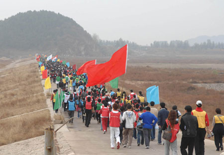 Participants walk in line near the Ming-tomb reservoir in Changping District of Beijing during the Beijing International Long Walk Carnival October 27, 2007. More than 10,000 participants from home and abroad took part in the walk. [Xinhua]
