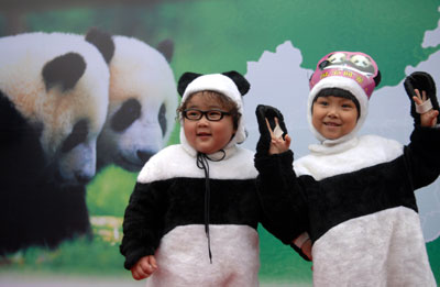 Two children, dressed like pandas, perform at a welcome ceremony for the twin pandas returning from Japan at the Chengdu research base of Giant Panda Breeding center in Southwest China's Sichuan Province Sunday, October 28, 2007. The pair, Ryuhin and Shuhin, both males, will be quarantined in a newly built house for two to three months before they are shown to visitors. [newsphoto]