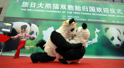 A welcome ceremony is held for the twin pandas returning from Japan at the Chengdu research base of Giant Panda Breeding center in Southwest China's Sichuan Province Sunday, October 28, 2007. The pair, Ryuhin and Shuhin, both males, will be quarantined in a newly built house for two to three months before they are shown to visitors. [newsphoto]