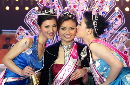 Photo taken on October 29, 2007 shows the champion Grace Cheung Ka Ying (C) from Hong Kong, runner-up Choi Ju Hee (R) from South Korea and the second runner-up, Hubei girl Sun Chen of the Miss Asia 2007 Competition which was held in Hong Kong. [Xinhua]