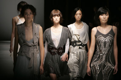 Models present a creation from Turkish designer Bora Aksu as part of Shanghai Fashion Week October 30, 2007. [Agencies]