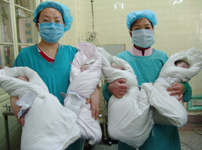 Nurses hold newly-born quadruplets, all of whom are boys, at a hospital in Xiangfan, Central China's Hubei Province October 30, 2007. Qin Lihua, 32, a woman from Nanyang, Central China's Henan Province, delivered four baby boys by Caesarean section yesterday and all of them are in good health. According to a local medical expert, it is extraordinarily rare to give birth to quadruplets by natural pregnancy (without any help of medicines) as one woman out of hundreds of thousands has that slim chance. Picture taken October 30, 2007. [newsphoto]