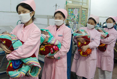 Nurses hold newly-born quadruplets, all of whom are boys, at a hospital in Xiangfan, Central China's Hubei Province October 30, 2007. Qin Lihua, 32, a woman from Nanyang, Central China's Henan Province, delivered four baby boys by Caesarean section yesterday and all of them are in good health. According to a local medical expert, it is extraordinarily rare to give birth to quadruplets by natural pregnancy (without any help of medicines) as one woman out of hundreds of thousands has that slim chance. Picture taken October 30, 2007. [newsphoto]