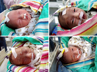 A combo picture shows newly-born quadruplets, all of whom are boys, lie at a a hospital in Xiangfan, Central China's Hubei Province October 30, 2007. Qin Lihua, 32, a woman from Nanyang, Central China's Henan Province, delivered four baby boys by Caesarean section yesterday and all of them are in good health. According to a local medical expert, it is extraordinarily rare to give birth to quadruplets by natural pregnancy (without any help of medicines) as one woman out of hundreds of thousands has that slim chance. Picture taken October 30, 2007. [newsphoto]