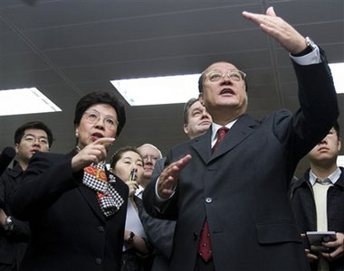 Li Changjiang (R), head of China's General Administration of Quality Supervision, Inspection and Quarantine (AQSIQ), shows the monitoring system on the foods processing and producing facilities to World Health Organization Director-General Dr. Margaret Chan (L) during her visit to the AQSIQ office in Beijing on Wednesday, October 31, 2007. The WHO chief praised China's moves to crack down on food-safety problems as the country stepped up efforts in recent months to clamp down on shoddy and dangerous goods. [Agencies]