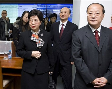 World Health Organization Director-General Dr. Margaret Chan (L), and Li Changjiang (R), head of China's General Administration of Quality Supervision, Inspection and Quarantine (AQSIQ), leave after watching the monitoring system on the foods processing facilities at the AQSIQ office in Beijing on Wednesday, October 31, 2007. The WHO chief praised China's moves to crack down on food-safety problems as the country stepped up efforts in recent months to clamp down on shoddy and dangerous goods. [Agencies]