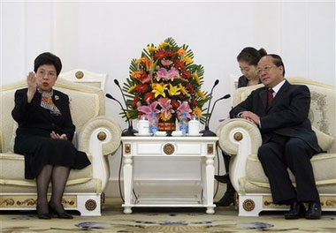 World Health Organization Director-General Dr. Margaret Chan (L), gestures while chatting with Li Changjiang, head of China's General Administration of Quality Supervision, Inspection and Quarantine (AQSIQ), during her visit to the AQSIQ office in Beijing, China, Wednesday, Oct. 31, 2007. The WHO chief praised China's moves to crack down on food-safety problems as the country stepped up efforts in recent months to clamp down on shoddy and dangerous goods. [Agencies]