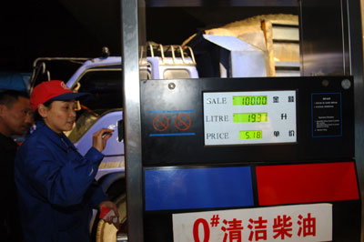 | An employee refuels a vehicle as the new price is shown on the screen at a gas station in Anqing, East China's Anhui Province, early Thursday morning, November 1, 2007. The National Development and Reform Commission (NDRC) announced Wednesday that the prices of gasoline, diesel oil and aviation kerosene would be raised by 500 yuan ($68) per ton. [Xinhua] |