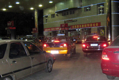 | Cars line up in front of a gas station in Beijing Wednesday night, October 31, 2007, a day before the fuel price rises came into effect. The National Development and Reform Commission (NDRC) announced that the prices of gasoline, diesel oil and aviation kerosene would be raised by 500 yuan ($68) per ton. [newsphoto] |
