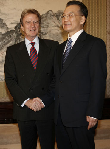 | French Foreign Minister Bernard Kouchner (L) is greeted by Chinese Premier Wen Jiabao (R) in the Zhongnanhai government compound in Beijing 31 October 2007. France's foreign minister held talks with China's leaders to pave the way for President Nicolas Sarkozy's visit. [Agencies] |