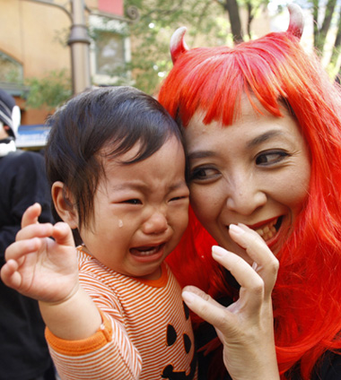 Updated: 2007-11-01 11:58 ![]() A baby carried by a participant dressed in a Halloween costume cries at parade in Kawasaki, south of Tokyo, October 28, 2007. The cult around fancy dress, and Japan's love of quirky festivals and eccentric trends in general, may go towards explaining why Halloween has turned from an obscure foreign celebration into a popular cultural event there. [Agencies]