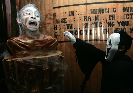 Updated: 2007-11-01 11:58 ![]() A boy dressed in a Halloween costume reacts to a moving statue inside a "haunted school" during a Halloween celebration at a mall in Manila October 31, 2007. [Agencies]
