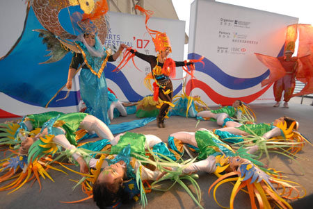 A photo taken on October 31, 2007 shows local college students put on performance during the closing ceremony of UK Arts Festival 2007 in Chongqing. [newsphoto]