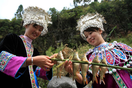 Two dressed-up girls of Miao ethnic minority make preparation for roasting carp in a village of Rongshui county, South China's Guangxi Zhuang Autonomous Region, November 1, 2007. It is the local tradition that people release fry into paddy fields when transplanting rice seedlings. The carp will grow much larger at the time of harvesting paddy. Then local residents catch the carp and roast them to enjoy the happiness of harvesting. [newsphoto]