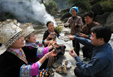 Farmers eat roast carp in a village of Rongshui county, South China's Guangxi Zhuang Autonomous Region, November 1, 2007. [newsphoto]