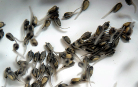 Updated: 2007-11-04 11:27 ![]() Eggs of Acipenser sinensis (Chinese sturgeon) hatch into alevins at the Chinese sturgeon Research Institute in Yichang, Central China's Hubei Province, November 3, 2007. For the first time, scientists in the institute successfully bred 100,000 alevins of the endangered fish. [Xinhua] |